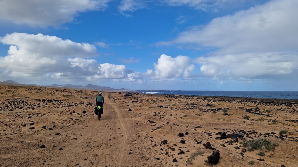 Rückblickend wohl der schönste, weil intensivste und längste Tag auf dem Rad: Die Fähre kam schon früh gegen 5 Uhr in Arrecife an, es wurde aber erst gegen 8 Uhr hell. Also bis gegen halb 7 gewartet, und dann noch mit Licht los: Nach ca. 2 Stunden und einer Kaffee-Pause waren wir da, wo wir für die ganze Tour eigentlich sein wollten: Endlose Sand- und Schotterpisten an der Küste, und das Gefühl von ewiger Weite. Es folgten ein paar Abschnitte über Lavagesteinsfelder im Inneren der Insel, bis es am Ende wieder lange Offroad an der Küste entlang ging.
